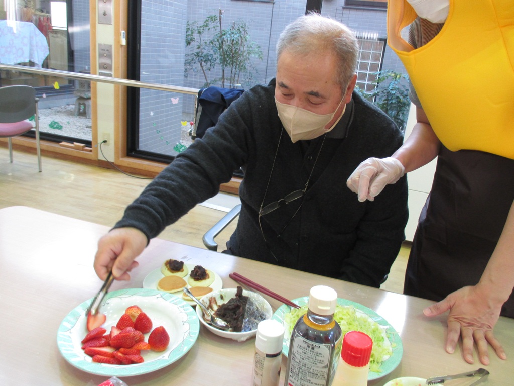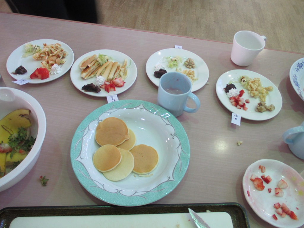バナナ、イチゴ、餡子、ホイップクリーム、キャベツと種類豊富なので、ご利用者様には、好きな組み合わせでトッピングを行っていただきました。