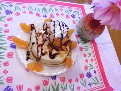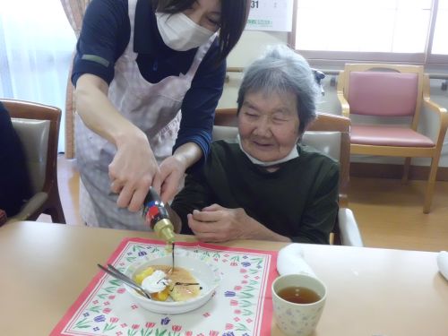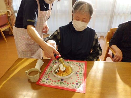 利用者様にホットケーキを焼いてもらい、チョコレートソース等好きな物でトッピング(*'▽')